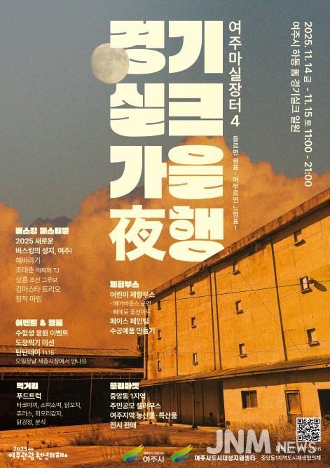 제이앤엠뉴스 | 여주시는 오는 11월 14일부터 15일까지 이틀간 여주 경기실크 일원(여주시 하동 123-6번지)에서 '여주마실장터4 가을야행'을 개최한다고 밝혔다. 이번 행사는 '2025 새로운 버스킹의 성지, 여주!'라는 슬로건 아래, 깊어가는 가을밤의 정취를 더할 버스킹 페스티벌과 함께 다채로운 마켓과 체험을 선보일 예정이다.