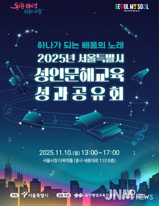 제이앤엠뉴스 | 서울시평생교육진흥원은 ‘하나가 되는 배움의 노래’를 주제로 10일 13시부터 17시까지 서울시청 본청 8층 다목적홀에서 ‘2025년 서울시 성인문해교육 성과공유회’를 개최했다. 이번 행사는 성인 문해학습자들이 한 해 동안의 학습 여정에서 얻은 경험과 결실을 나누고, 새로운 배움에 대한 열망을 확인하는 장으로 마련됐다.