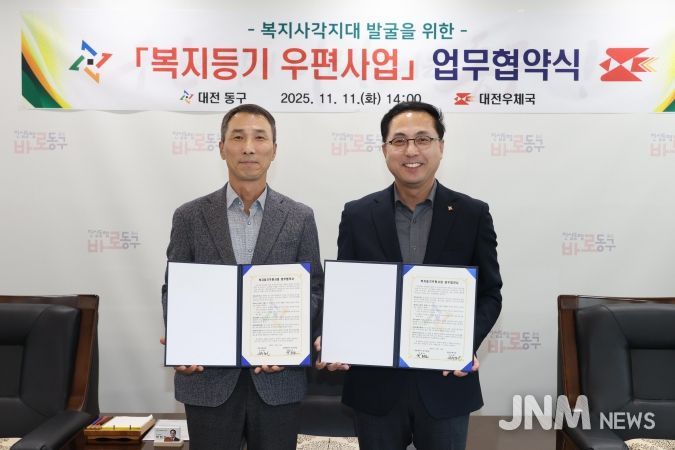 제이앤엠뉴스 | 대전 동구는 11일 구청장 접견실에서 대전우체국(국장 선우환)과 ‘복지등기우편사업’ 업무협약을 체결했다고 밝혔다.
