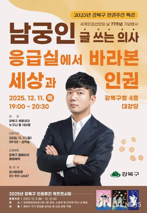 제이앤엠뉴스 | 서울 강북구는 오는 12월 11일 오후 7시, 강북구청 대강당에서 ‘2025년 세계인권선언의 날 기념 명사특강’을 개최한다고 밝혔다.