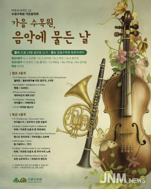 제이앤엠뉴스 | 수원특례시가 14일 오전 11시 일월수목원 방문자센터 물빛누리홀에서 ‘가을 수목원, 음악에 물든 날’ 가든 음악회를 연다.