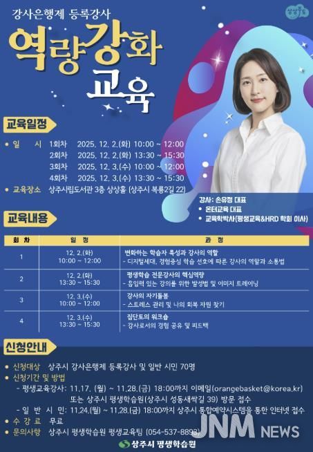 제이앤엠뉴스 | 상주시는 11월 17일부터 11월 28일까지‘2025년 강사은행제 등록강사 역량강화 교육’수강생 70명을 모집한다.