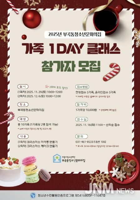 참가 신청은 11월 18일 오전 11시부터 부곡동청소년문화의집 현장 방문 또는 기관 홈페이지를 통해 선착순으로 진행되며, 체험비는 한 가족당 10,000원이다. 기타 프로그램에 관한 자세한 사항은 부곡동청소년문화의집 홈페이지 공지사항을 확인하면 된다.