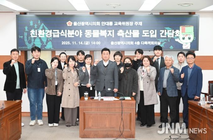 제이앤엠뉴스 | 울산광역시의회 교육위원회 안대룡 위원장은 11월 14일 오후 2시, 시의회 4층 다목적회의실에서 ‘친환경급식분야 동물복지 축산물 도입 간담회’를 열고, 울산광역시교육청, 구·군 관계자, 지역 동물복지 인증농가 및 관련 기관들과 울산 학교급식의 지속가능성과 동물복지 강화를 위한 정책 방향을 논의했다.