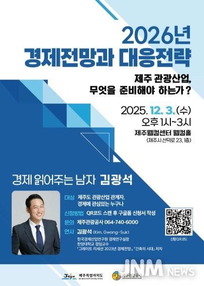 제이앤엠뉴스 | 제주특별자치도와 제주관광공사(사장 고승철)는 ‘경제 읽어주는 남자’로 유명한 김광석 한양대학교 겸임교수를 초청, 오는 12월 3일 제주웰컴센터에서 ‘2026년 경제 전망과 대응 전략 : 제주 관광산업, 무엇을 준비해야 하는가?’를 주제로 특강을 진행한다고 14일 밝혔다.