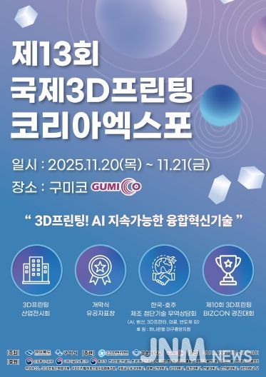 제이앤엠뉴스 | 구미시는 11월 20일부터 21일까지 2일간 구미코에서 '제13회 국제3D프린팅코리아엑스포'를 개최한다. 올해로 13회를 맞이한 이번 행사는 3D프린팅 산업을 대표하는 전시회로, 3D프린팅 산업 활성화와 기술 교류를 위한 다양한 프로그램을 진행한다.