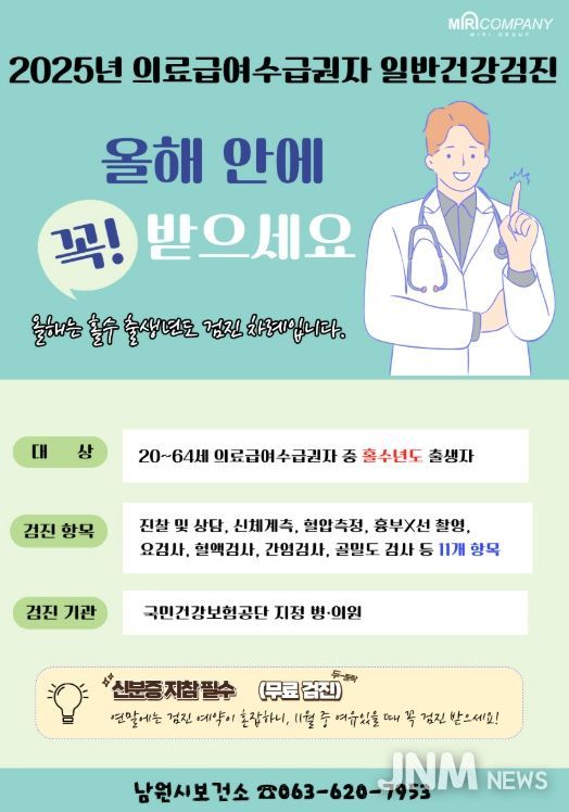 제이앤엠뉴스 | 남원시보건소는 의료 취약계층의 질병 예방 및 조기 발견을 위한 의료급여수급권자 대상 무료 일반건강검진을 적극 독려하고 있다.