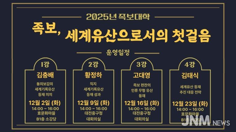제이앤엠뉴스 | 대전 중구는 오는 12월 2일부터 23일까지 매주 화요일, 총 4회에 걸쳐 2025 족보대학 ‘족보, 세계유산으로서의 첫 걸음’프로그램을 운영한다고 밝혔다.