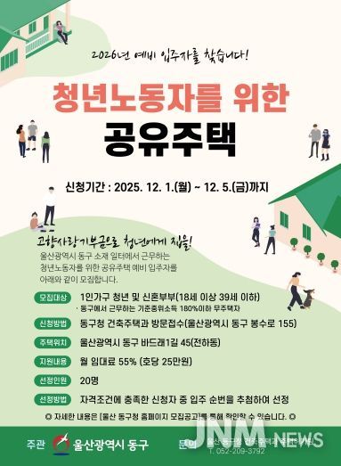 제이앤엠뉴스 | 울산 동구는 동구 지역에서 근무하는 무주택 청년의 주거 안정을 위해 조성한 ‘청년 노동자 공유주택’의 2026년 입주 예비 입주자를 오는 12월 1일부터 5일까지 모집한다.