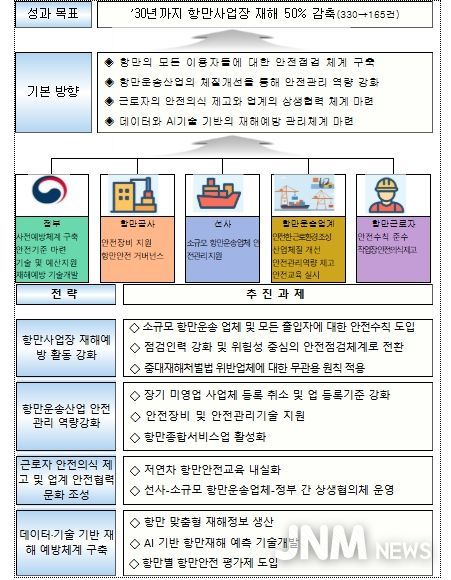 이에 해양수산부는 2030년까지 항만사업장 재해 건수 50% 감축(330건→165건)을 목표로 「항만사업장 안전사고 예방 강화대책」을 마련하고, 그에 따른 4대 전략과 11개 과제를 집중 추진한다.