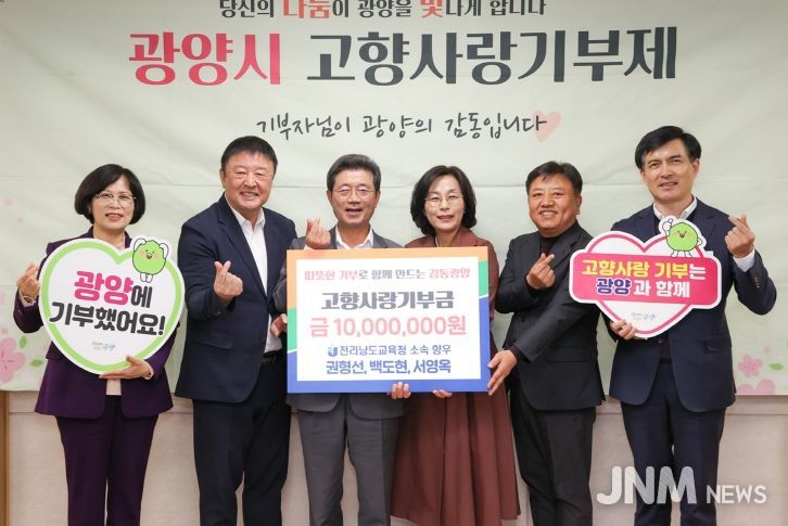 제이앤엠뉴스 | 광양시는 전남교육청 소속 광양출신 향우 3명이 고향사랑의 뜻을 모아 총 1,000만 원의 고향사랑기부금을 전달했다고 밝혔다.