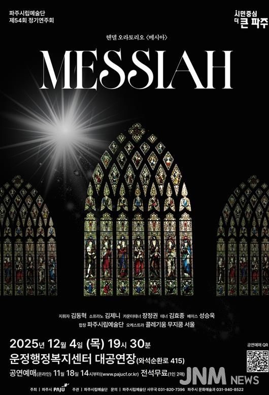 제이앤엠뉴스 | 파주시는 오는 12월 4일 19시 30분, 운정행복센터 대공연장에서 시립예술단 제54회 정기연주회 ‘헨델 오라토리오 '메시아'’를 선보인다고 밝혔다.