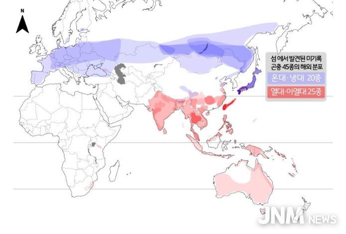 국립호남권생물자원관 연구진이 이들 미기록종을 분석한 결과, 55.5%인 25종이 열대·아열대성 곤충이며, 나머지 20종은 온대·냉대성 곤충으로 나타났다.