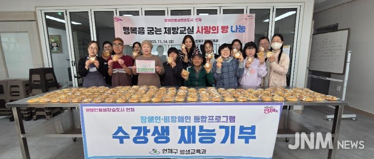 제이앤엠뉴스 | 연제구는 11월 14일 아델라디저트아카데미학원에서 장애인과 장애인 가족들로 구성된 수강생들이 2달여 간 배운 제빵 기술로 앙금 소보루빵 100개를 만들어 장애인직업재활시설부산직업재활원 장애인 근로자에게 전달하는 행복을 굽는 제빵교실 ‘사랑의 빵’ 나눔을 진행했다고 밝혔다.