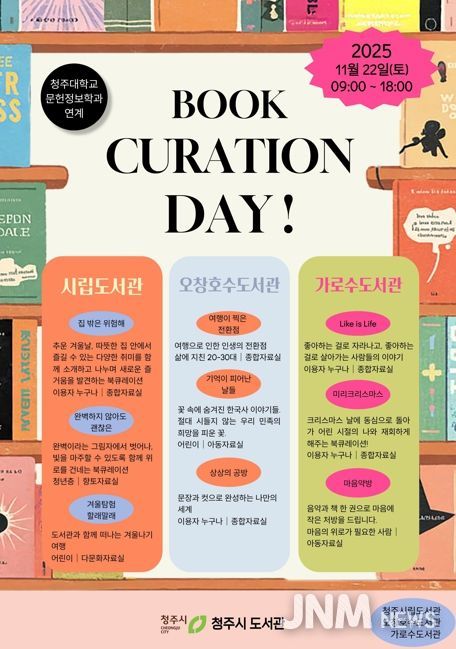 제이앤엠뉴스 | 청주시립도서관은 청주대학교 문헌정보학과(지도교수 김혜영)와 함께 오는 22일 오전 9시부터 오후 6시까지 △시립도서관 △오창호수도서관 △가로수도서관 등 3개 도서관에서 ‘북큐레이션 데이’를 동시에 개최한다고 밝혔다.