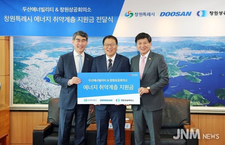 제이앤엠뉴스 | 창원특례시는 20일 두산에너빌리티(부회장 정연인)와 창원상공회의소(회장 최재호)가 지역 내 에너지취약계층을 위해 총 1억 8000만 원을 기탁했다고 밝혔다.