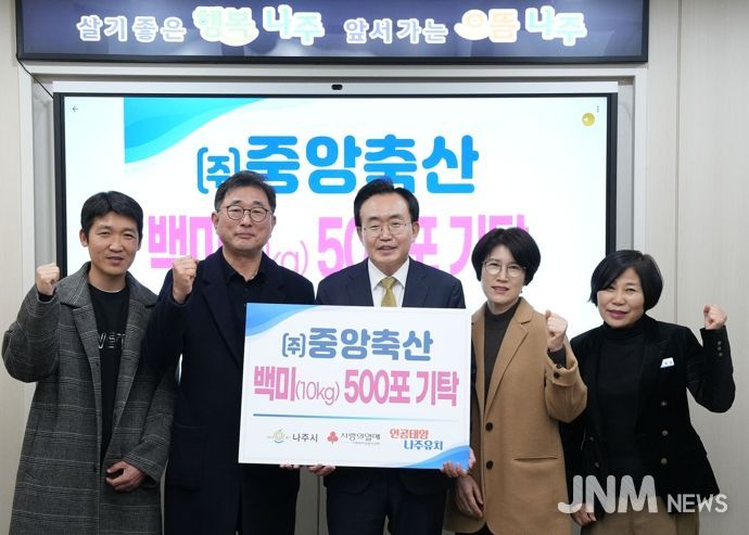 제이앤엠뉴스 | 전라남도 나주시가 지역기업 ㈜중앙축산으로부터 사회복지시설과 취약계층을 위한 백미 500포 기탁을 받아 겨울철 생활안정을 위한 나눔 확산에 나섰다.