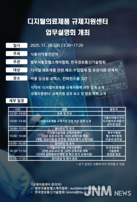 제이앤엠뉴스 | 식품의약품안전처는 '디지털의료제품법' 시행 첫 해를 마무리하면서 디지털의료기기 산업계의 목소리를 듣기 위한 업계 허가·심사 간담회(11월 25일) 및 업무설명회(11월 28일)를 개최한다.