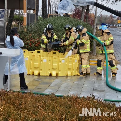제이앤엠뉴스 | 나주소방서는 11월 25일 나주 혁신도시에 위치한 한국전력공사(KEPCO) 본사 데이터센터에서 리튬이온배터리 화재 발생을 가정한 합동소방훈련을 실시했다고 밝혔다.