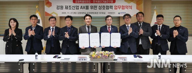 제이앤엠뉴스 | 강원특별자치도는 11월 27일 오후 3시, 강원 제조산업의 AX(AI Transformation, 인공지능 전환)를 위한 상호 협력을 강화하기 위해 한국생산기술연구원(원장 이상목)과 업무협약(MOU)을 체결했다.