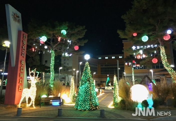 함평군은 5일 “노인복지관, 가족센터, 청소년센터 3개 기관이 함께 함평군천지종합복지관 앞 정원에 크리스마스트리, 달, 토끼 등 다양한 조형물과 야간경관을 설치했다”고 밝혔다.
