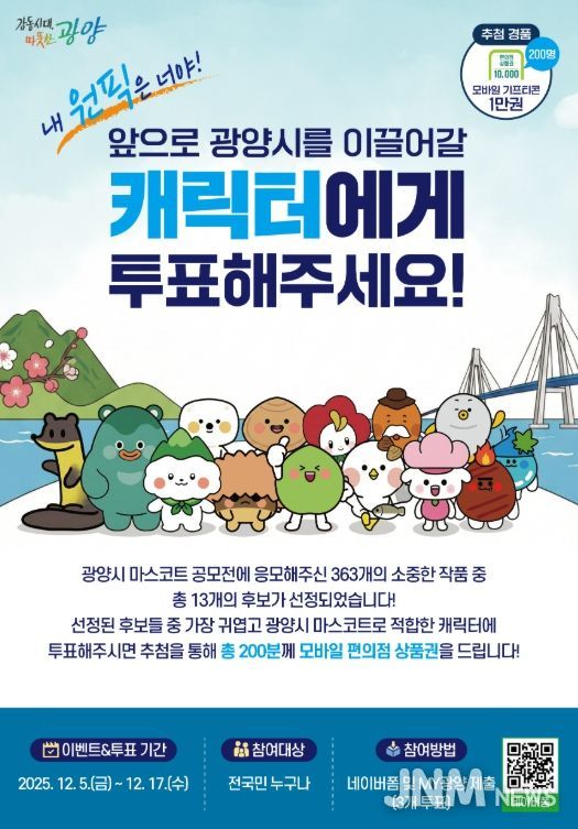 제이앤엠뉴스 | 광양시는 앞으로 시의 정체성과 이미지를 대표할 새로운 캐릭터 선정을 위해 12월 5일부터 17일까지 선호도 투표를 진행한다고 5일 밝혔다.