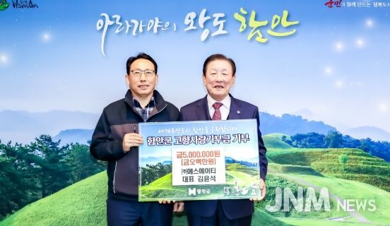 제이앤엠뉴스 | 함안군은 지난 5일 대산면 소재 기업 에스에이티(SAT)가 고향사랑기부금 500만 원을 기탁했다고 밝혔다. 기탁식은 군청에서 열렸으며 조근제 함안군수와 에스에이티 대표 김윤석 등이 참석해 따뜻한 분위기 속에서 진행됐다.