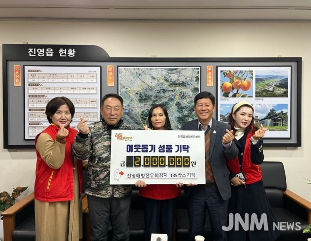 제이앤엠뉴스 | 김해시 진영읍행정복지센터(읍장 이정호)는 5일 진영해병전우회(김재범 회장)에서 200만원 상당 김장김치 135박스를 기탁했다고 밝혔다.