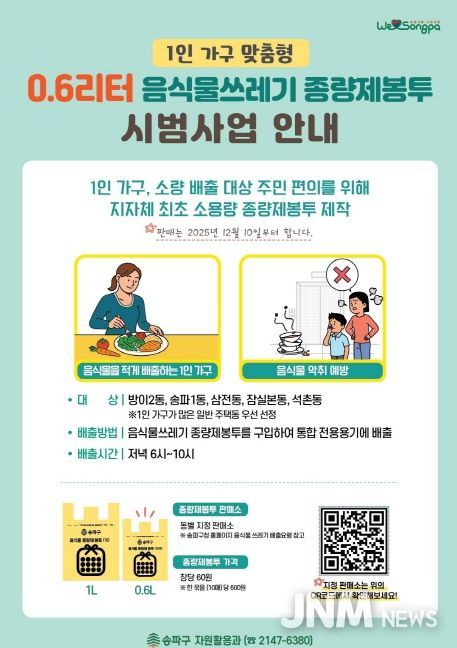 제이앤엠뉴스 | 서울 송파구가 전국 지방자치단체 최초로 1인 가구에 최적화된 0.6ℓ 규격의 음식물쓰레기 종량제봉투를 오는 10일부터 시범 도입해 운영한다고 알렸다.