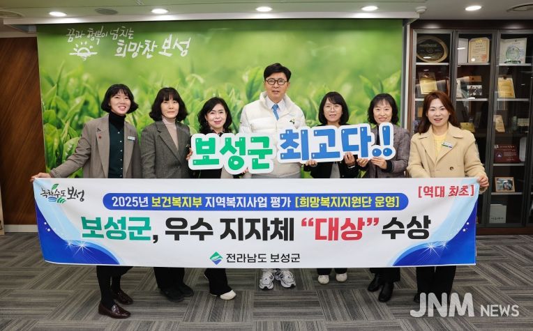 제이앤엠뉴스 | 보성군은 지난 7일 보건복지부가 실시한 2025년 지역복지사업 평가 ‘희망복지지원단 운영’ 분야에서 전국 우수 지방자치단체로 선정돼 ‘대상’을 수상했다고 밝혔다.