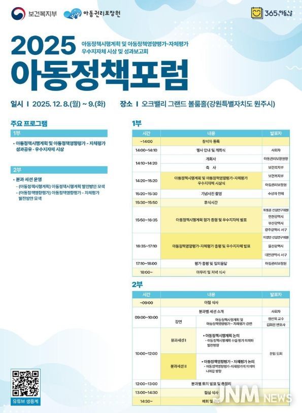 제이앤엠뉴스 | 보건복지부와 아동권리보장원(원장 정익중)은 12월 8일 14시 오크밸리 그랜드볼룸 홀(강원도 원주)에서 '2025년 아동정책포럼'을 개최한다.