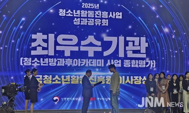 제이앤엠뉴스 | (재)연천군청소년육성재단(청소년수련관) 늘다솜 청소년방과후아카데미는 지난 11월 28일 성평등가족부와 한국청소년활동진흥원이 주최하는 2025년 청소년활동진흥사업 통합 성과공유회에서 최우수 기관 선정 및 한국청소년활동진흥원 이사장상을 수상했다.