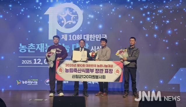 제이앤엠뉴스 | 산청군 120자원봉사회는 지난 9일 세종컨벤션센터에서 열린 ‘제10회 대한민국 농촌재능나눔 대상’ 시상식에서 농림축산식품부 장관 표창을 수상했다고 11일 밝혔다.