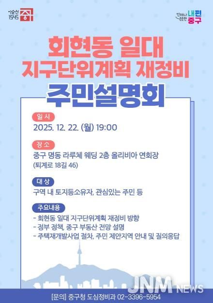 제이앤엠뉴스 | 서울 중구가 오는 22일 저녁 7시, 명동(퇴계로18길 46)에서 회현동 일대 지구단위계획 도심재정비를 위한 주민 설명회를 개최한다.