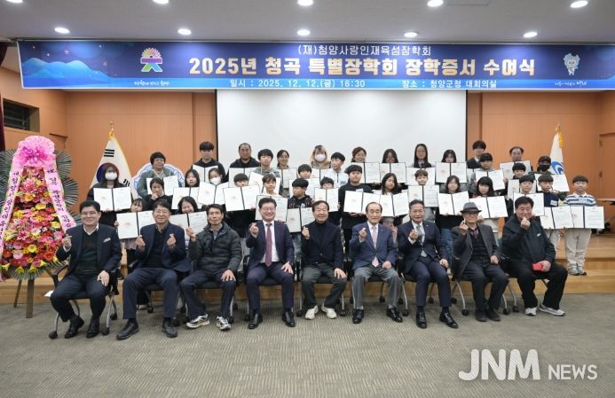 제이앤엠뉴스 | (재)청양사랑인재육성장학회는 지난 12일 군청 대회의실에서 ‘2025년도 청곡 특별장학회(회장 유병권) 장학증서 수여식’을 개최하고, 지역 학생 53명에게 총 2,330만 원의 장학금을 전달했다.
