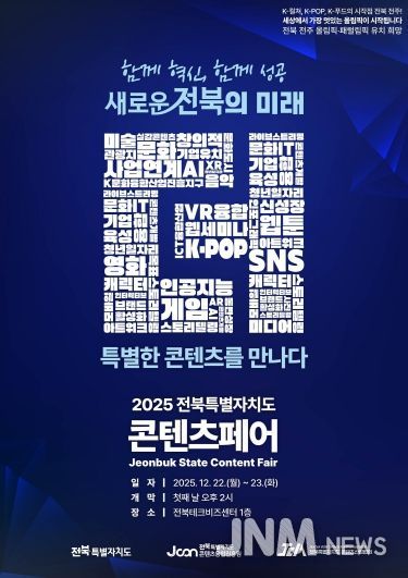 제이앤엠뉴스 | (재)전북특별자치도 콘텐츠융합진흥원과 전북특별자치도 콘텐츠산업협회는 ‘2025 전북특별자치도 콘텐츠페어’를 오는 12월 22일 오후 2시, 전북테크비즈센터에서 공동 주관으로 개최한다고 밝혔다.