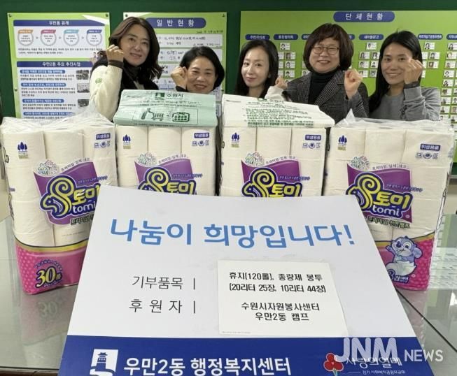 제이앤엠뉴스 | 수원시 팔달구 우만2동은 지난 12일, 수원시자원봉사센터 우만2동 캠프로부터 휴지와 종량제 봉투 기부를 전달받는 뜻깊은 시간을 가졌다.