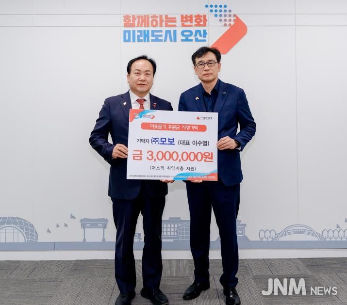 제이앤엠뉴스 | 오산시는 지난 16일 ㈜모보로부터 지역 내 저소득 취약계층 지원을 위한 후원금 300만 원을 기탁받았다고 밝혔다.