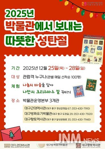 제이앤엠뉴스 | 대구문화예술진흥원 박물관운영본부 소속 대구 시립 3개 박물관(대구근대역사관·대구방짜유기박물관·대구향토역사관)에서는 성탄절을 맞아, 12월 25일부터 28일까지 관람객을 대상으로 ‘2025년 박물관에서 보내는 따뜻한 성탄절 –나만의 크리스마스 씰 꾸미기-’ 문화행사를 진행한다.