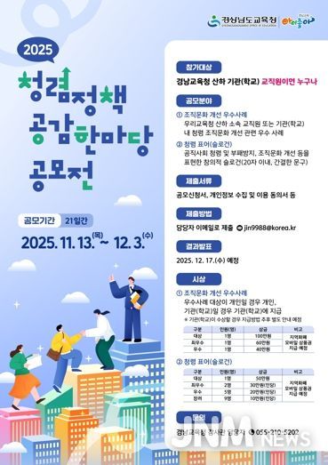 제이앤엠뉴스 | 경상남도교육청은 반부패·청렴 문화를 확산하기 위해 추진한 ‘2025년 청렴 정책 공감 한마당 공모전’의 수상작을 발표했다.