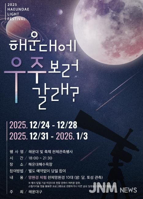 제이앤엠뉴스 | 해운대구가 해운대빛축제 특별 이벤트 ‘우주 보러 갈래’를 12월 24~28일, 12월 31일~1월 3일에 운영한다.