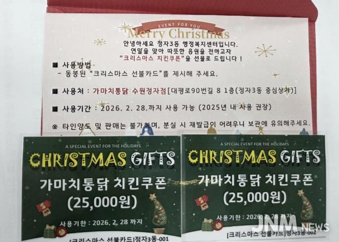 제이앤엠뉴스 | 수원시 장안구 정자3동은 지난 18일 관내 저소득 한부모가족 33세대에 치킨쿠폰을 전달하며 연말 온정을 전했다.