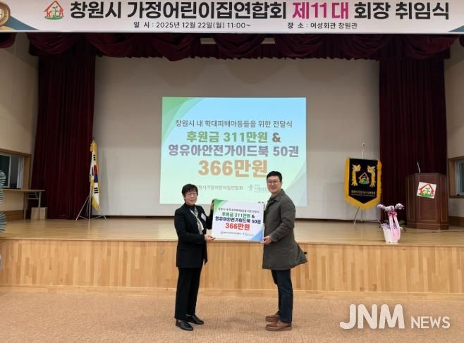제이앤엠뉴스 | 창원특례시는 창원시가정어린이집연합회에서 22일 개최된 제10·11대 회장 이취임식을 맞이하여 관내 학대피해아동을 지원하기 위한 후원금과 도서를 창원시아동보호전문기관에 전달했다고 밝혔다.