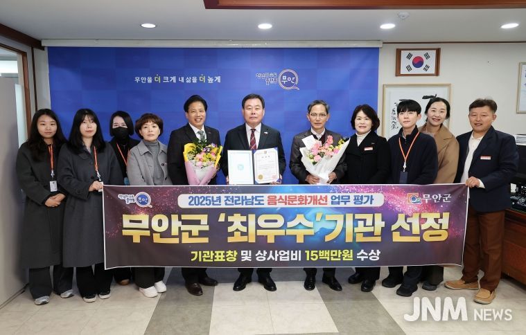 제이앤엠뉴스 | 무안군은 전라남도 주관 2025년 음식문화개선 사업 평가에서 ‘최우수’ 기관으로 선정되어 기관 표창과 함께 상사업비 1천5백만 원을 확보했다.