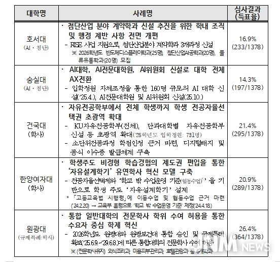 올해에는 '고등교육법 시행령'과 '대학설립·운영 규정' 개정 등 그간의 규제 개선* 내용을 토대로, 첨단 분야 계약학과 및 입학 정원 증원 등을 활용한 첨단 분야 학과 신설, 소단위 전공 과정과 연계한 전공자율선택제 확대 등 다양한 대학 혁신 사례들이 응모됐다. 1단계 전문가 평가 후 일반 국민들의 체감도를 반영하기 위한 2단계 온라인 국민심사(12.8~12.10., 소통24 온라인 투표)를 실시하여, 최종 5개 대학을 선정했다.
