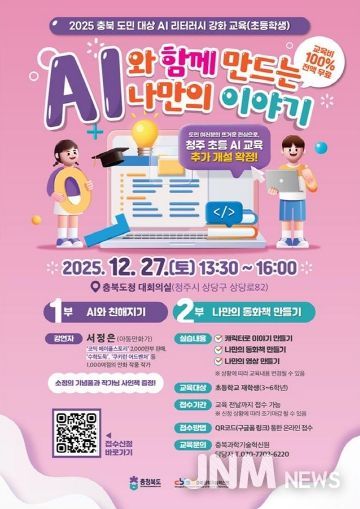 제이앤엠뉴스 | 충청북도는 오는 12월 27일 13:30 충북도청 대회의실에서 도내 초등학생(3~6학년)과 학부모 200여명을 대상으로 ‘AI 웹툰 교육(중부권 2차)’을 진행한다고 밝혔다. 이번 교육은 북부권(충주), 남부권(옥천), 중부권 1차(청주)에 이어 2025년 마지막으로 개최되는 도내 AI 창작 체험 프로그램이다.