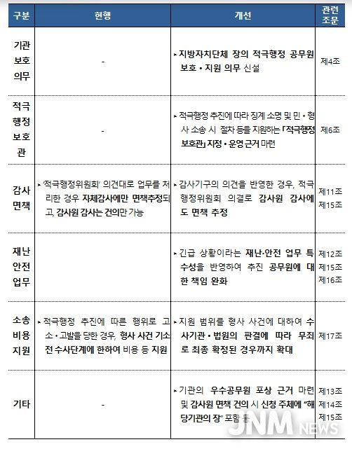 적극행정 추진으로 징계 소명 및 민·형사상 소송이 진행되는 경우 소속기관 차원의 보호·지원이 의무화되고, 적극행정 보호관을 지정해 공무원을 보호해야 한다.