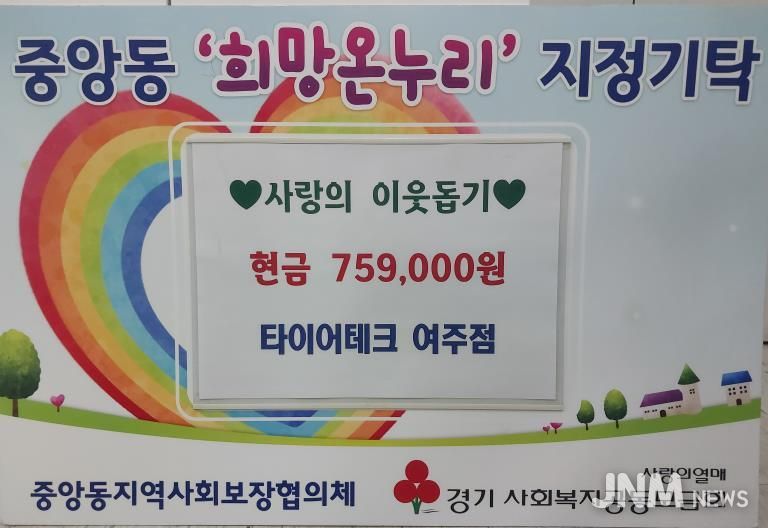 제이앤엠뉴스 | 타이어테크 여주점은 지난 23일 연말을 맞아 지역사회 취약계층을 돕기 위해 성금 75만9천원을 중앙동행정복지센터에 기탁했다.