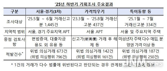 이번 기획조사는▴서울·경기 주택 이상거래(’25.5월~6월 거래신고분),▴부동산 실거래가 띄우기(’23.3월~’25.8월 거래신고분), ▴특이동향 등(’25.1월~7월 거래신고분) 3가지 분야에 대해 실시됐다.