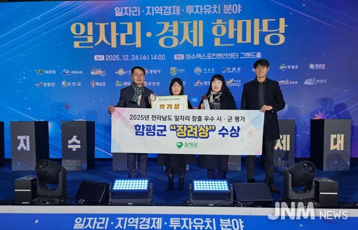 함평군은 지난 24일 여수 엑스포컨벤션센터 그랜드홀에서 열린 ‘전라남도 일자리·경제 한마당 행사’에서 2025년 일자리 창출 우수 시군 평가 결과 ‘장려상’을 수상했다고 25일 밝혔다. 이는, 2018년 수상 이후 7년 만의 쾌거이다.